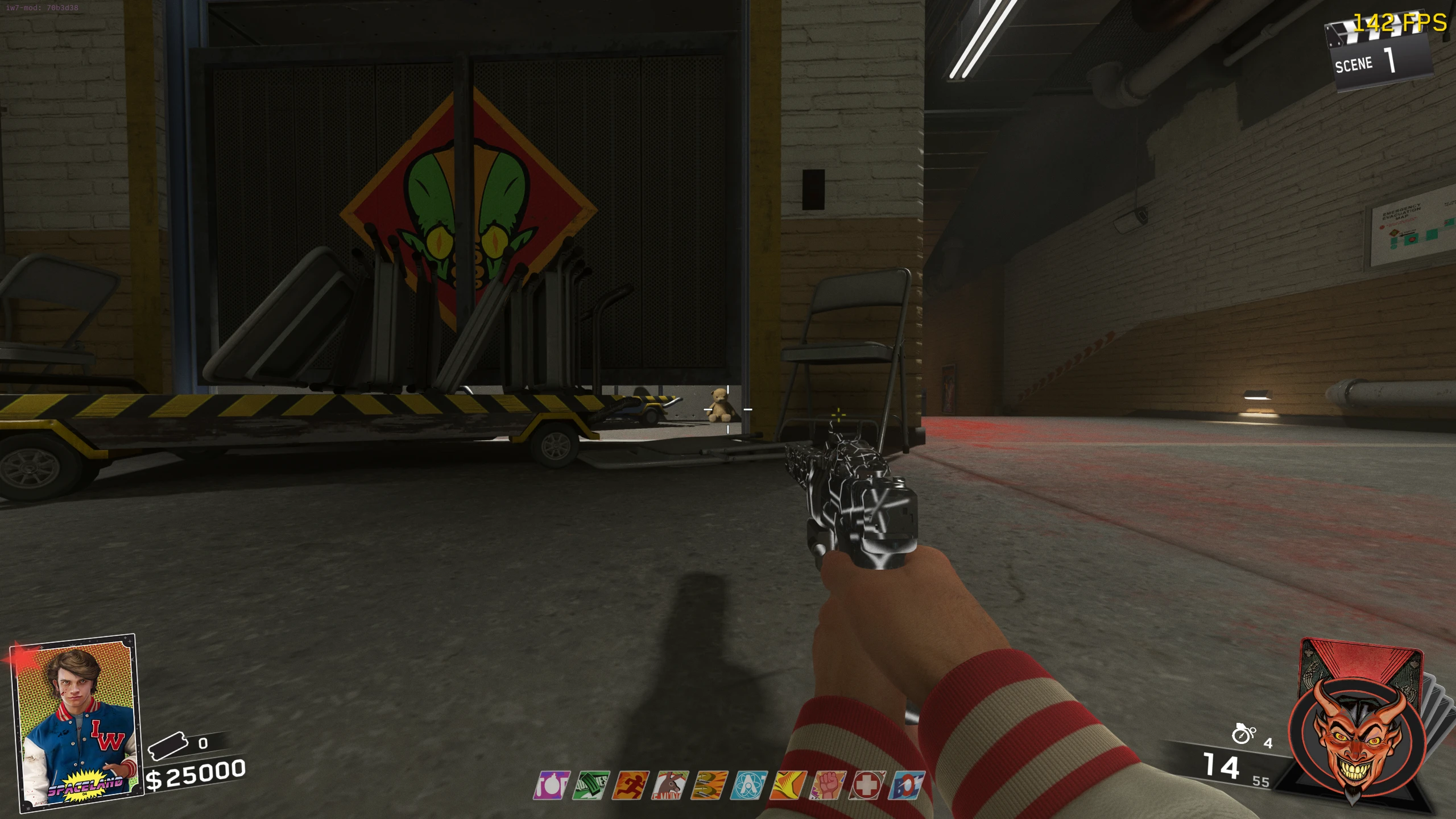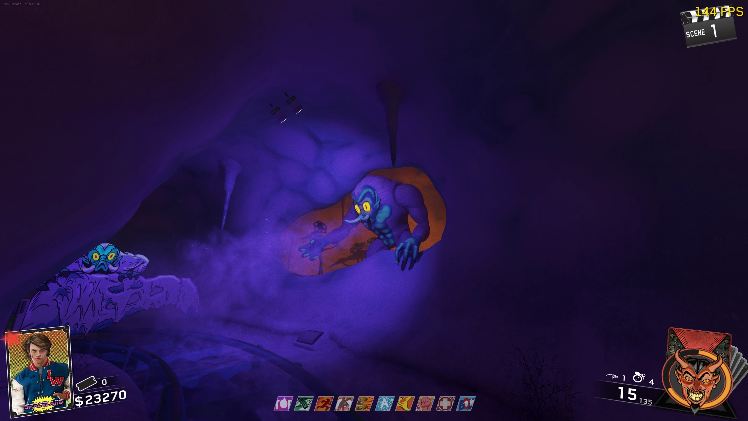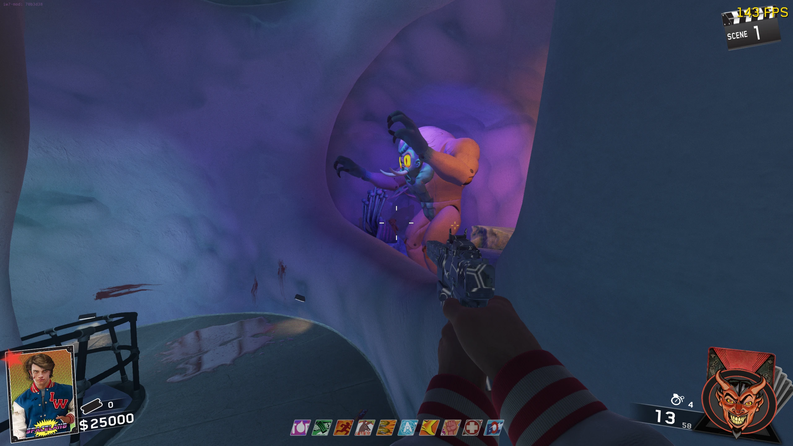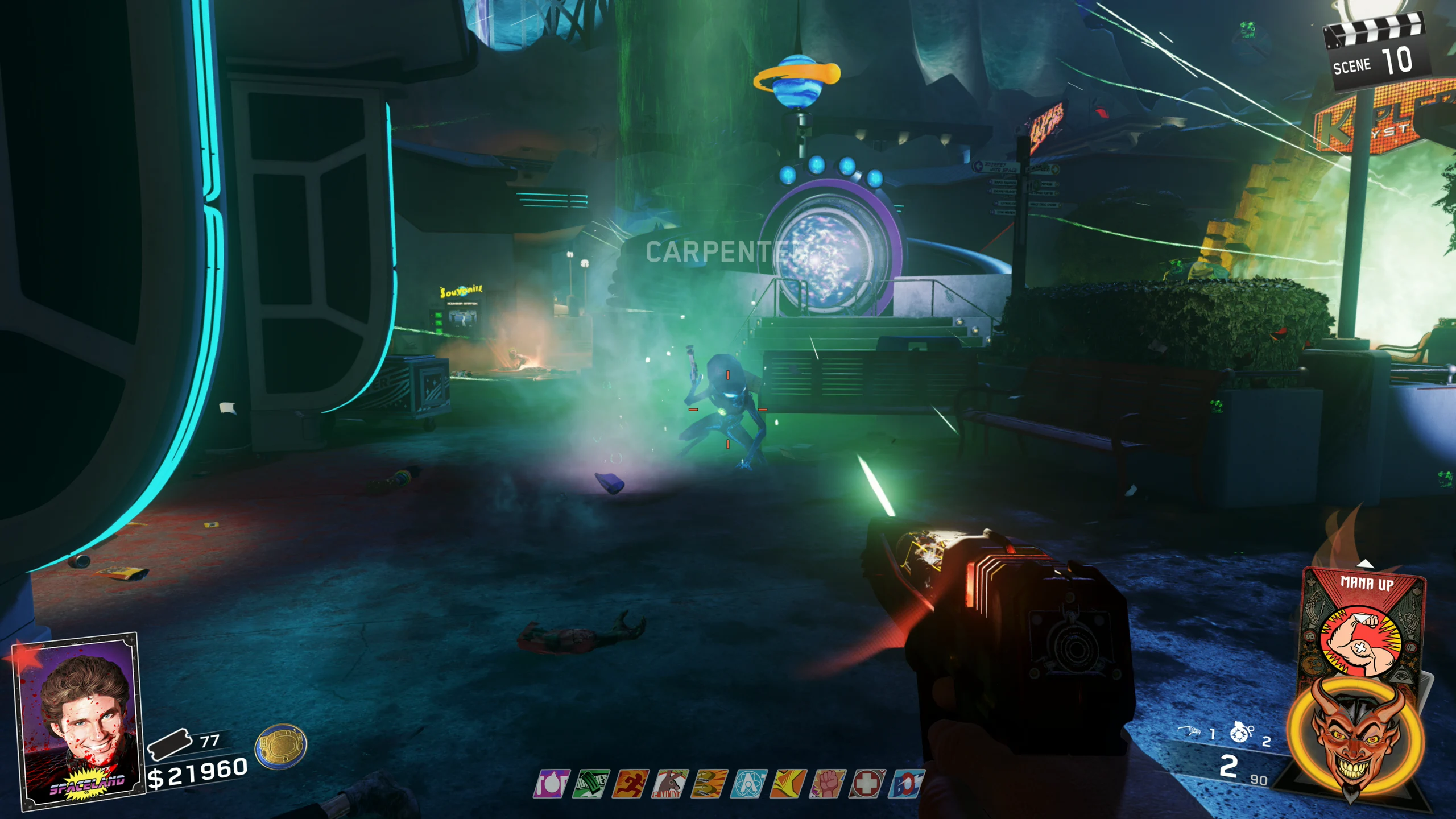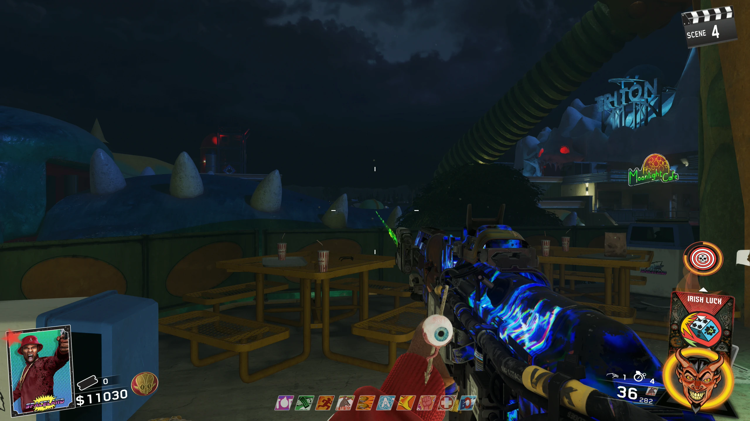 - The Alien will teleport around the arena, mostly on the rooftops but not always. The Alien will occasionally shoot the player with their gun, launch an energy blast out of the other (gun-less) hand, or spawn Zombies near the player.